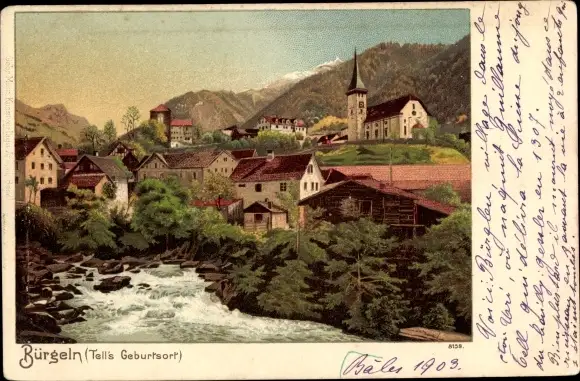 Litho Bürglen Kt Uri Schweiz, Ortsansicht, Tell's Geburtsort