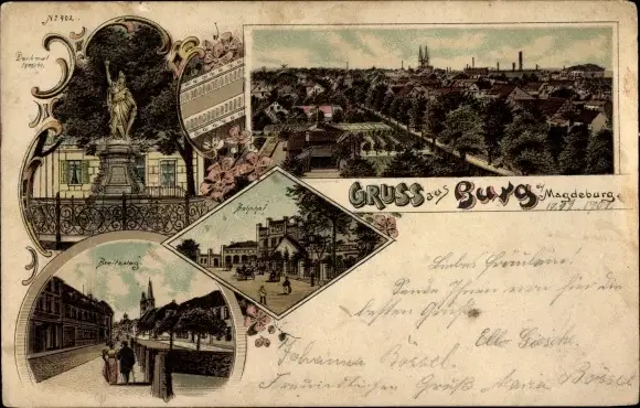 Litho Burg bei Magdeburg, Denkmal, Breitesteg, Bahnhof, Panorama
