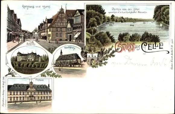Litho Celle in Niedersachsen, Rathaus, Markt, Schloss, Stadtkirche, Postamt