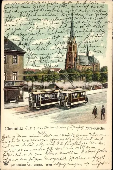 Litho Chemnitz in Sachsen, Petrikirche, Straßenbahnen