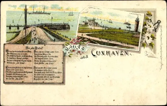 Litho Cuxhaven in Niedersachsen, Alte Liebe, Seepavillon, Leuchtturm