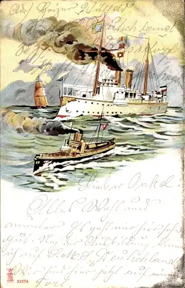 Litho Dampfer, Dampfschiff, Segelschiff