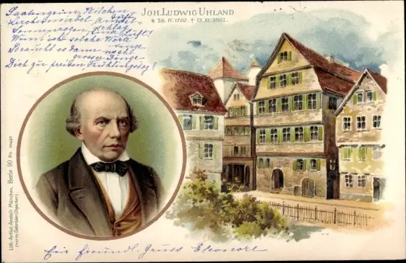 Litho Dichter Johann Ludwig Uhland, Portrait, Geburtshaus in Tübingen
