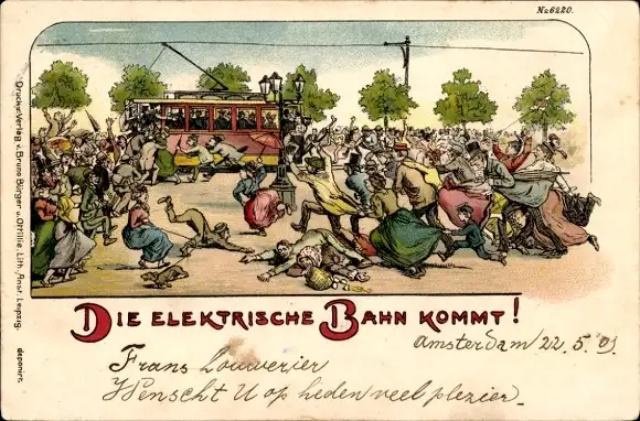 Litho Die elektrische Bahn kommt, Menschen eilen zur Straßenbahn