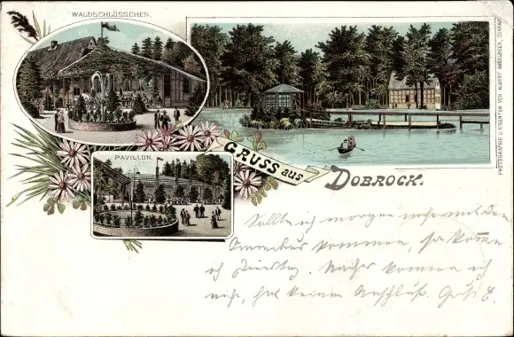 Litho Dobrock Wingst in Niedersachsen, Waldschlösschen, Pavillon, Teich