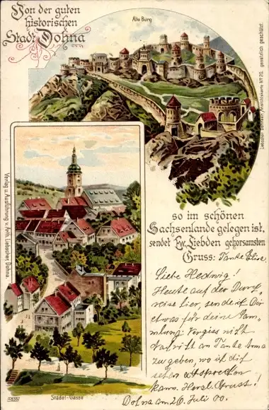 Litho Dohna in Sachsen, Alte Burg, Blick auf Stadt und Kirche