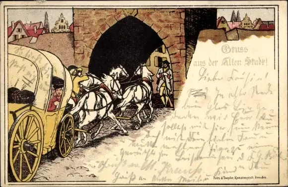 Litho Dresden Altstadt, Partie am Tor, Kutsche, Damen, Pferde