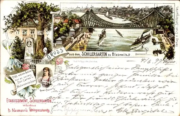 Litho Dresden Blasewitz, Stadt, Brücke, Schillergarten, Denkmal