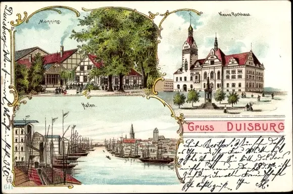 Litho Duisburg im Ruhrgebiet , Monning, Neues Rathaus, Hafen