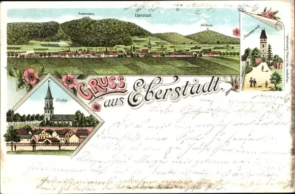 Litho Eberstadt Darmstadt in Hessen, Kirche, Frankensteig, Panorama