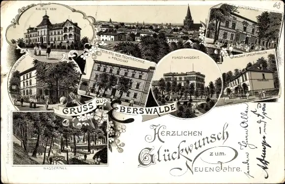 Litho Eberswalde in der Mark, Forst-Akademie, Wasserfall, Töchterschule, Pensionat, Neujahr