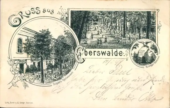 Litho Eberswalde in der Mark, Rohde's Restaurant, Konzertgarten, Kriegerdenkmal