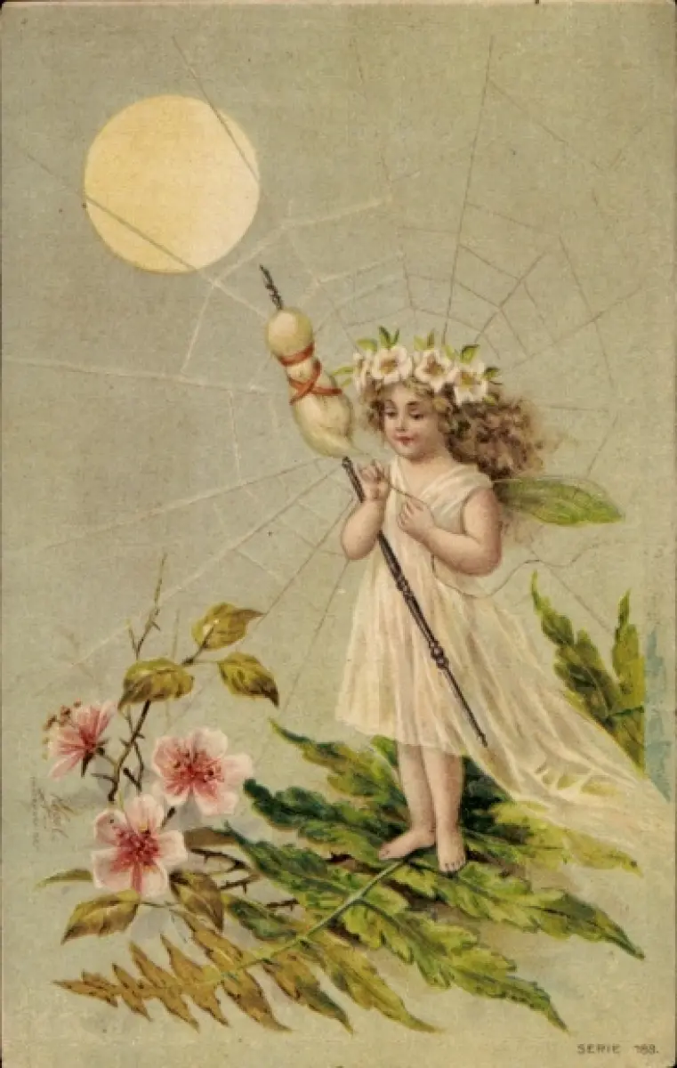 Litho Elfe mit Spindel, Spinnennetz, Blumen