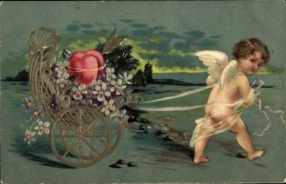 Litho Engel, Karre, Veilchen, Herz, Kitsch
