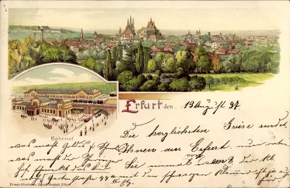 Litho Erfurt in Thüringen, Bahnhof, Totalansicht der Ortschaft, Dom