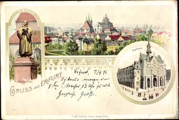 Litho Erfurt in Thüringen, Lutherdenkmal, Rathaus, Stadtbild