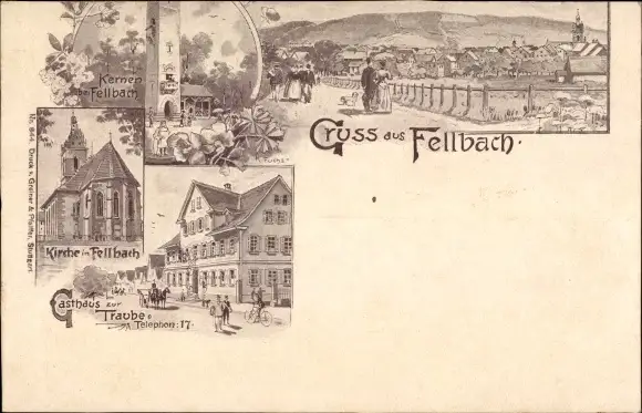 Litho Fellbach in Württemberg, Kirche, Gasthaus zur Traube, Kernen Turm