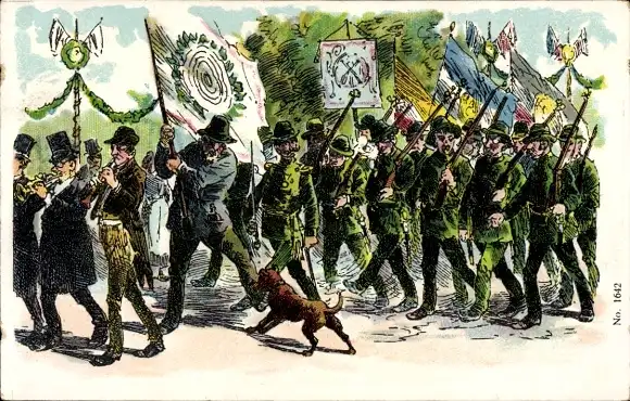Litho Fest, Marschierende Jäger, Hund, Fahnen