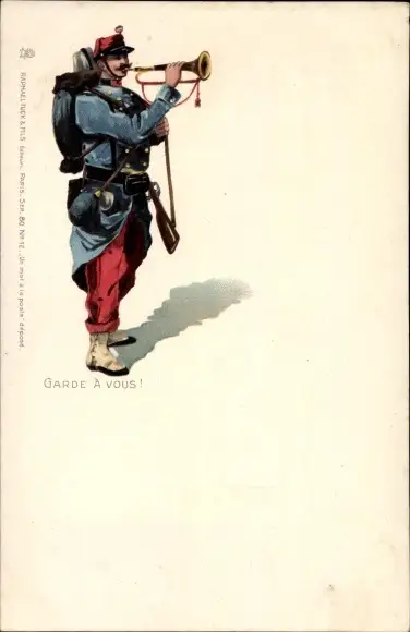 Litho Französischer Soldat in Uniform bläst ein Signal