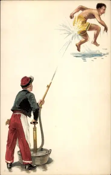 Litho Französischer Soldat spritz Mann mit Wasserschlauch ab