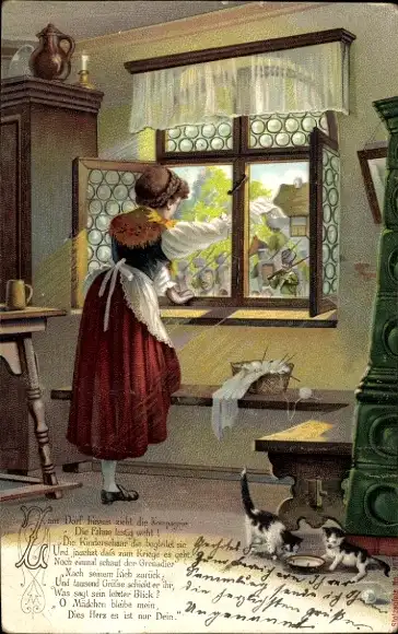 Litho Frau am Fenster begrüßt marschierende Soldaten, Katzen