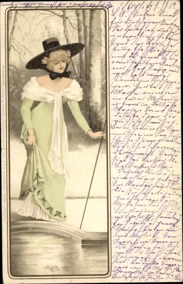 Litho Frau in grünem Kleid mit schwarzem Hut an einem Teich