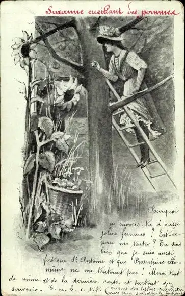 Litho Frau klettert eine Leiter hoch, Sonnenblumen