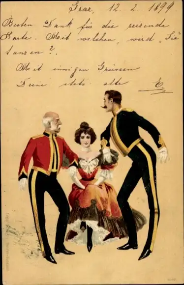 Litho Frau mit zwei Verehrern, Liebe