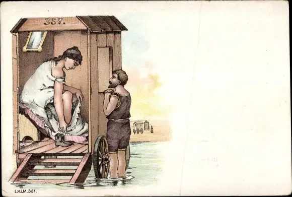 Litho Frau zieht sich im Strandhäuschen um, Neugieriger Mann, Strandleben, Umkleidekabine