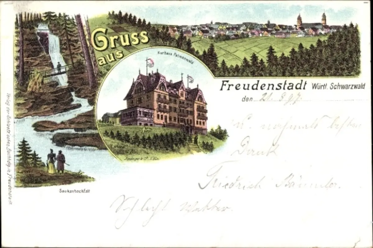 Litho Freudenstadt im Schwarzwald, Gesamtansicht, Sankenbach-Wasserfall, Kurhaus
