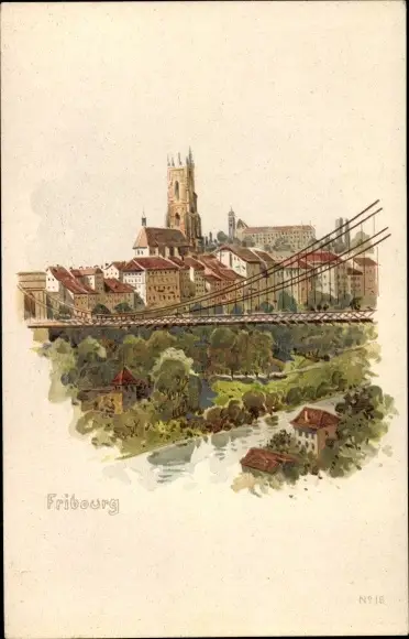 Litho Fribourg Freiburg Stadt Schweiz, Teilansicht mit Brücke
