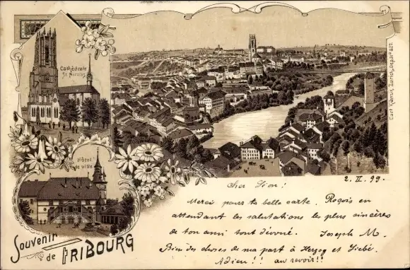 Litho Fribourg Freiburg Stadt Schweiz, Totalansicht, Kathedrale, Rathaus