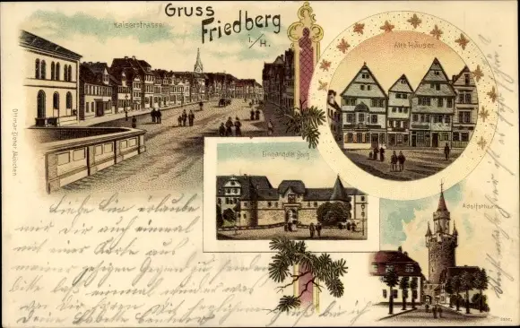Litho Friedberg in Hessen, Kaiserstraße, Alte Häuser, Burg, Adolfsturm