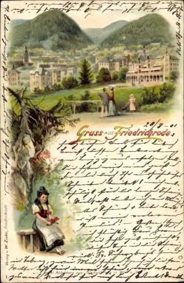Litho Friedrichroda im Thüringer Wald, Ortsansicht, Mädchen in Tracht