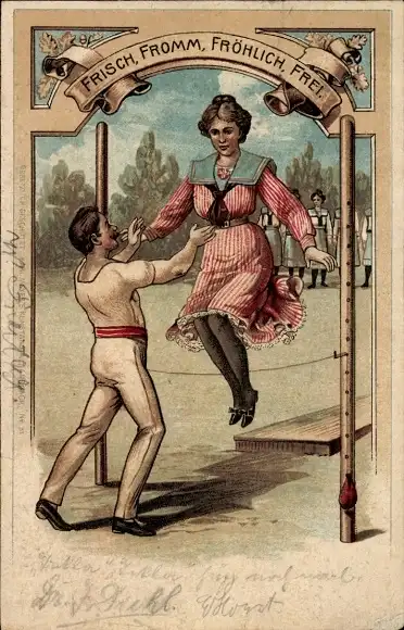 Litho Frisch, fromm, fröhlich, frei, Turnbewegung, Dame beim Hochsprung