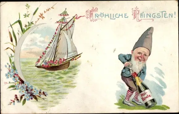Litho Fröhliche Pfingsten, Zwerg, Segelboot, Maibowle
