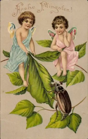 Litho Frohe Pfingsten, Elfen, Maikäfer