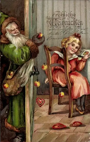 Litho Frohe Weihnachten, Weihnachtsmann, Mädchen
