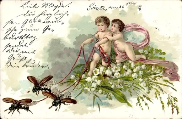 Litho Frühlingsgruß, Maikäfer, Elfen, Maiglöckchen