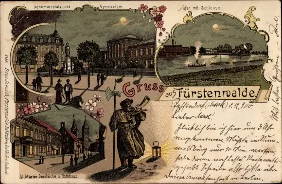 Litho Fürstenwalde an der Spree, Denkmalsplatz, Gymnasium, Hafen, Schleuse, St. Marien Domkirche
