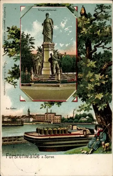 Litho Fürstenwalde an der Spree, Kriegerdenkmal, Hafen