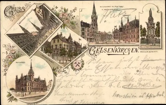Litho Gelsenkirchen im Ruhrgebiet, Rathaus, Bahnhofstraße, Neumarkt, Postamt, Kriegerdenkmal
