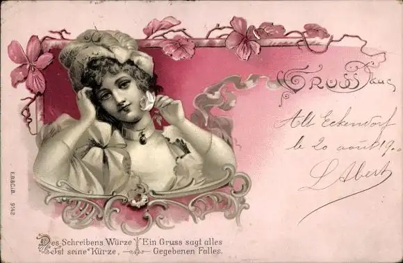 Litho Gemaltes Porträt einer Frau, Hut, Blumen