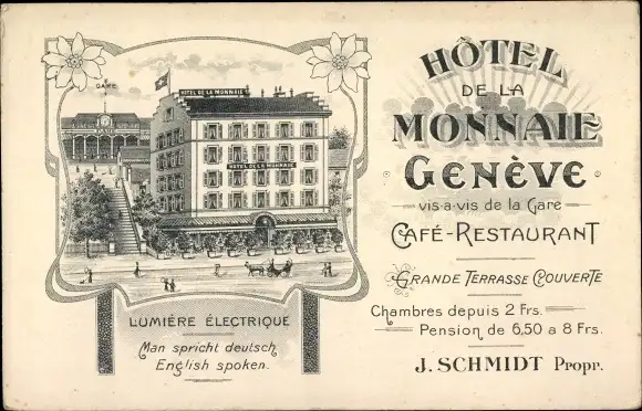 Litho Genève Genf Schweiz, Hotel de la Monnaie, vis-a-vis de la Gare, Propr. J. Schmidt