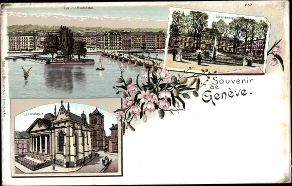 Litho Genève Genf Schweiz, L'Universite, La Cathedrale, Blick auf die Stadt