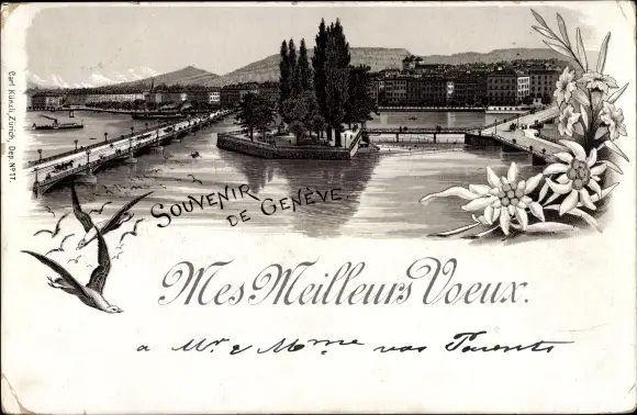 Litho Genève Genf Stadt, Gesamtansicht mit Uferpartie