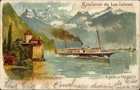 Litho Genf Kanton Schweiz, Lac Leman, Salondampfer