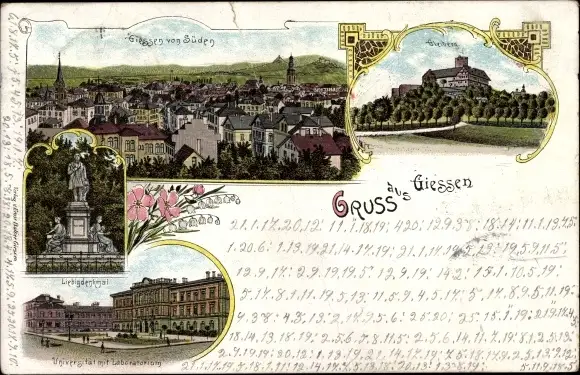 Litho Gießen an der Lahn Hessen, Blick auf den Ort, Universität mit Laboratorium, Liebigdenkmal