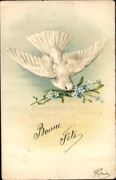Litho Glückwunsch, Bonne Fete, Taube, Vergissmeinnicht