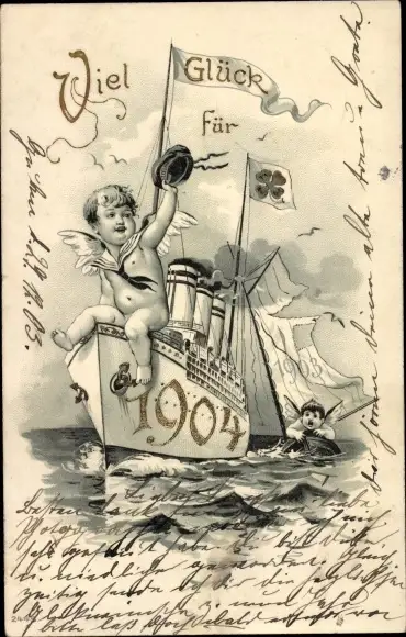 Litho Glückwunsch Neujahr 1904, Engel, Dampfer, Glücksklee